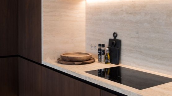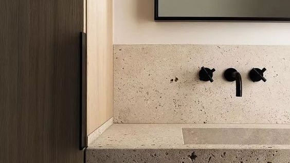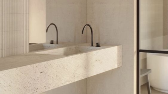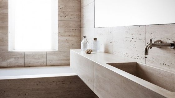 O travertino é uma rocha calcária, composta de calcita, aragonita e limonita, com bandas compactas, paralelas entre si, nas quais se observam pequenas cavidades. Pode ser usado natural ou resinado.